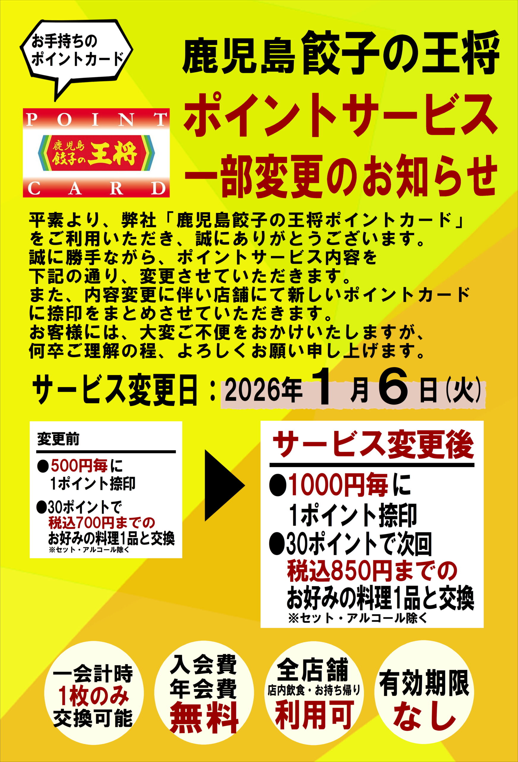 平素より、弊社「鹿児島 餃子の王将ポイントカード」をご利用いただき