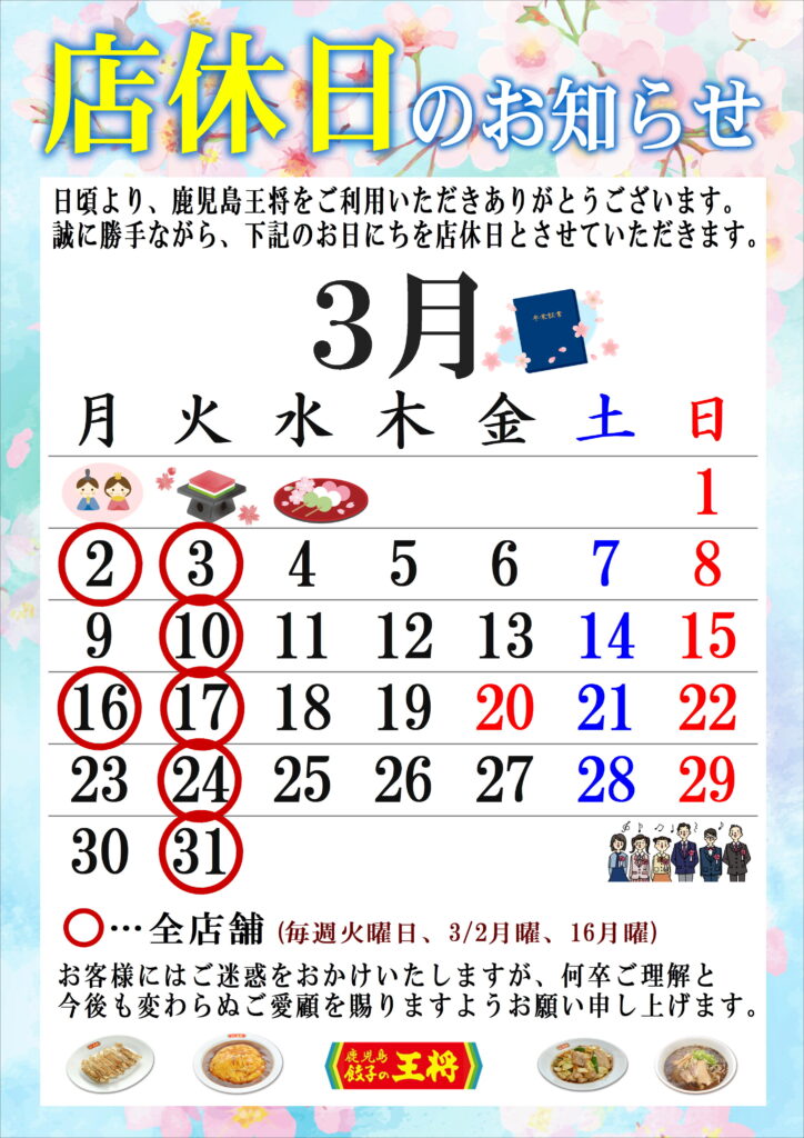 3月 定休日のお知らせ いつも鹿児島 餃子の王将をご利用いただき、ありがとうございます。 誠に勝手ながら、2026年3月の店休日は以下のようにさせていただきます。 【全店舗】 3/2(月)、3(火)、10(火)、16(月)、17(火)、24(火)、31(火) 3月20日(金)祝日は全店舗営業いたします ぜひお近くの際には、ご利用ください! お持ち帰りや出前館でもご注文できます Tweet
